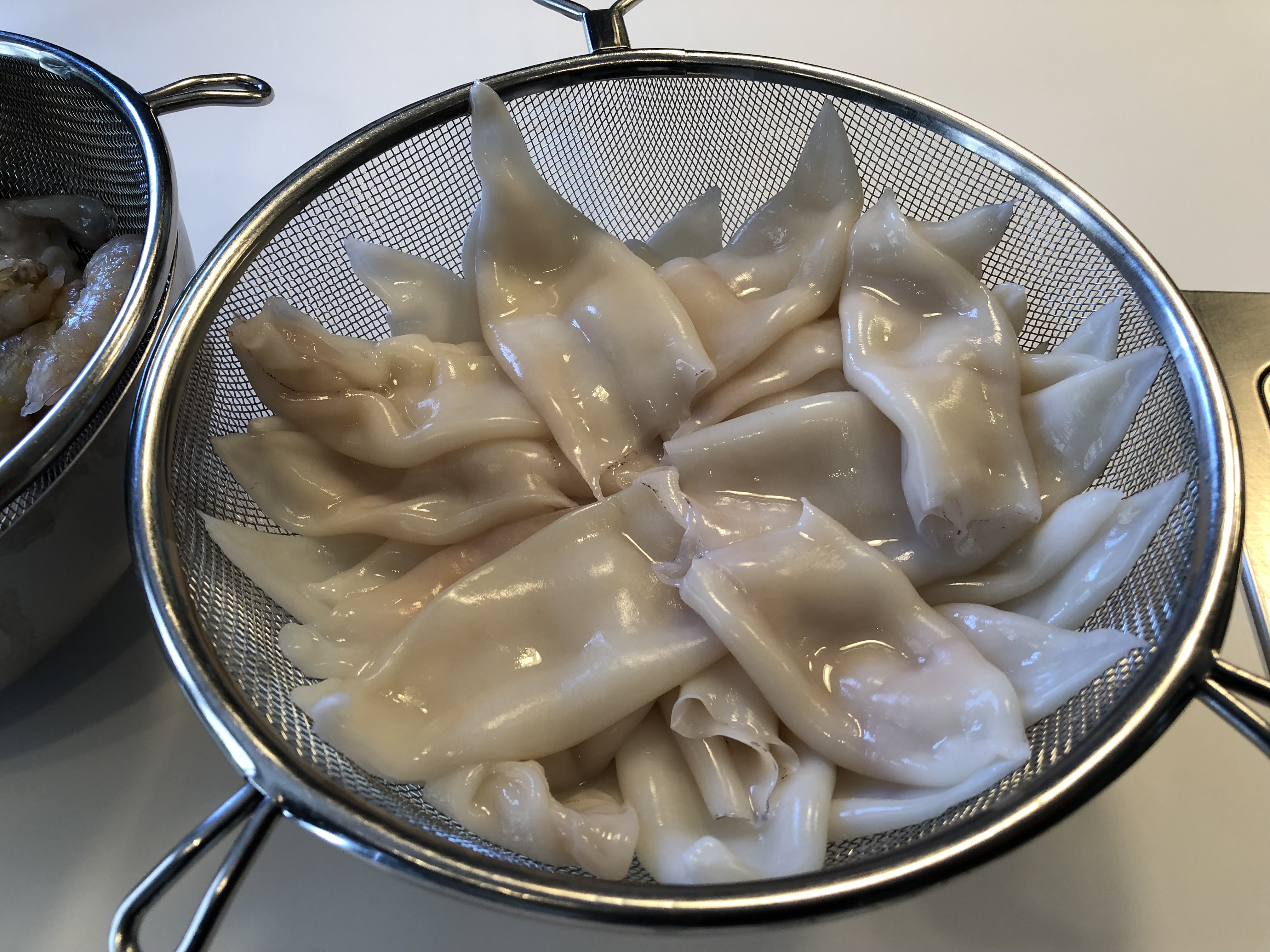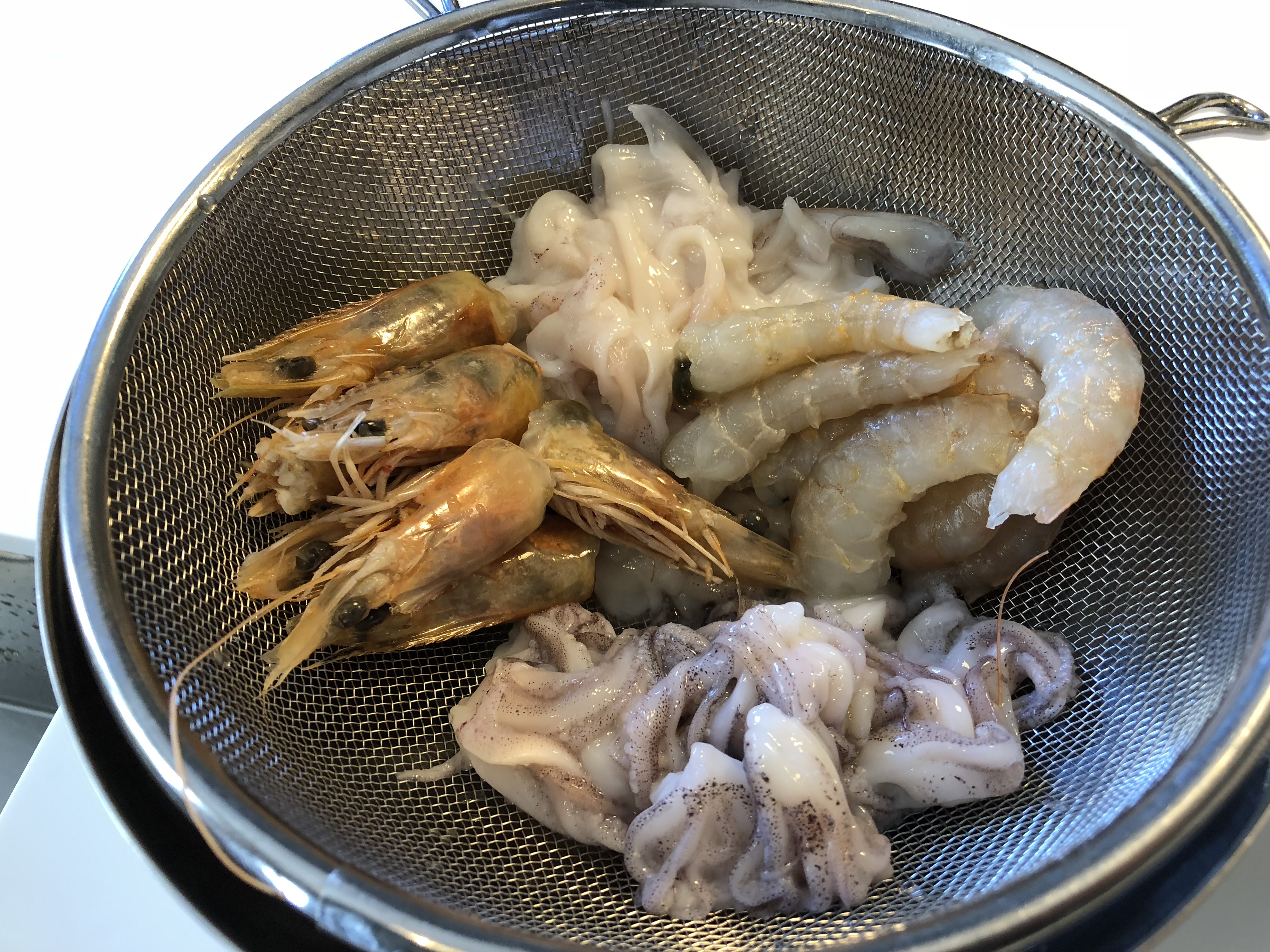 A continuación, pelamos los langostinos, reservamos las cabezas, limpiamos la tripa y guardamos filmadas las colas. Por otra parte, tenemos los chipirones ya limpios, sin tripa, separados los cuerpos de las aletas y las patitas y los ponemos a escurrir bien. Seguidamente, picamos la cebolla y el pimiento, pelamos, despepitamos y picamos el tomate, picamos el perejil y reservamos.