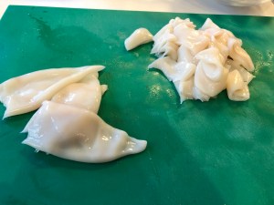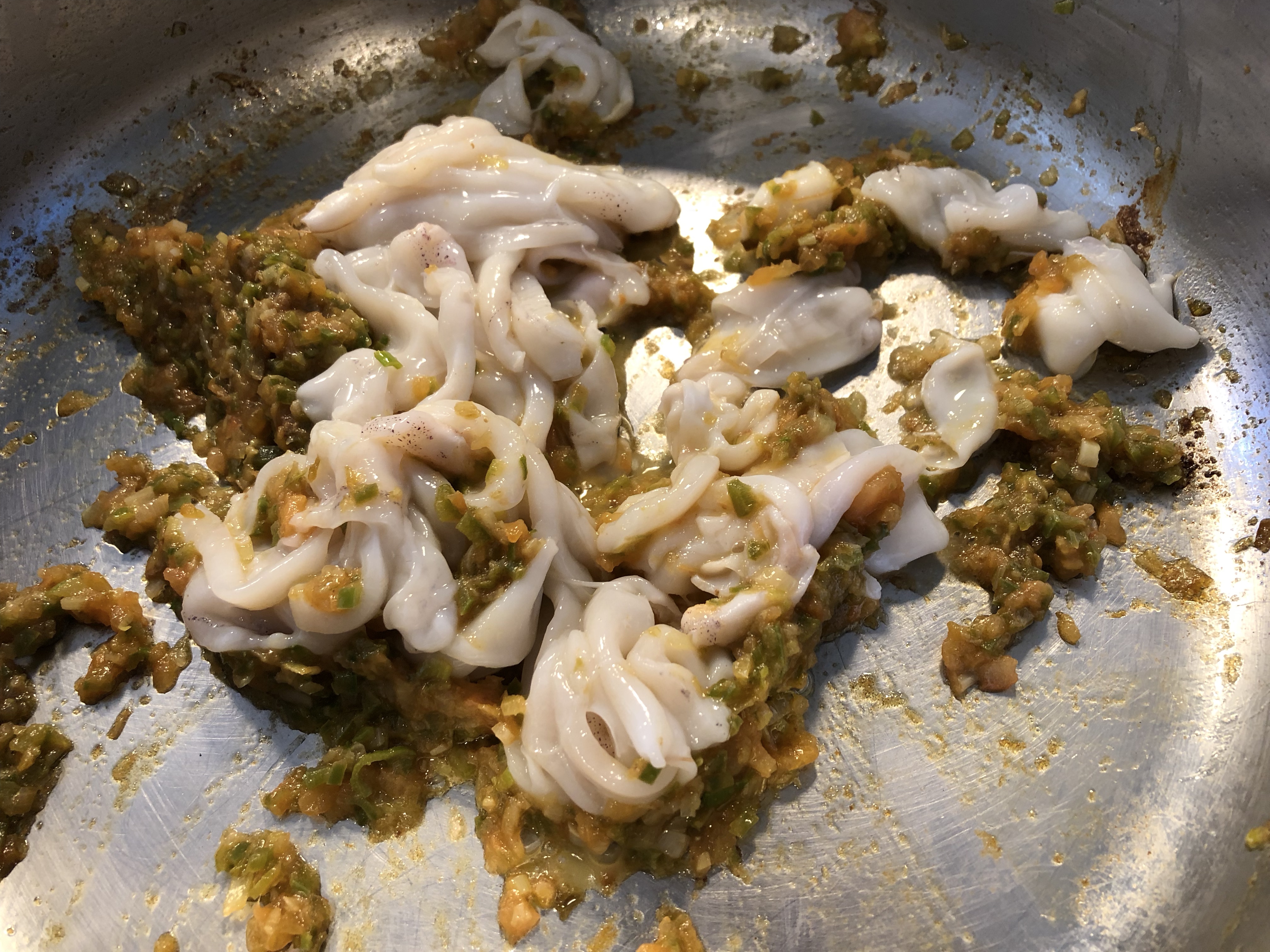 Incorporamos entonces aletas y recortes de los chipirones, salteamos un poco y añadimos el agua de la cocción de las cabezas y lo dejamos hasta casi evaporar del todo.