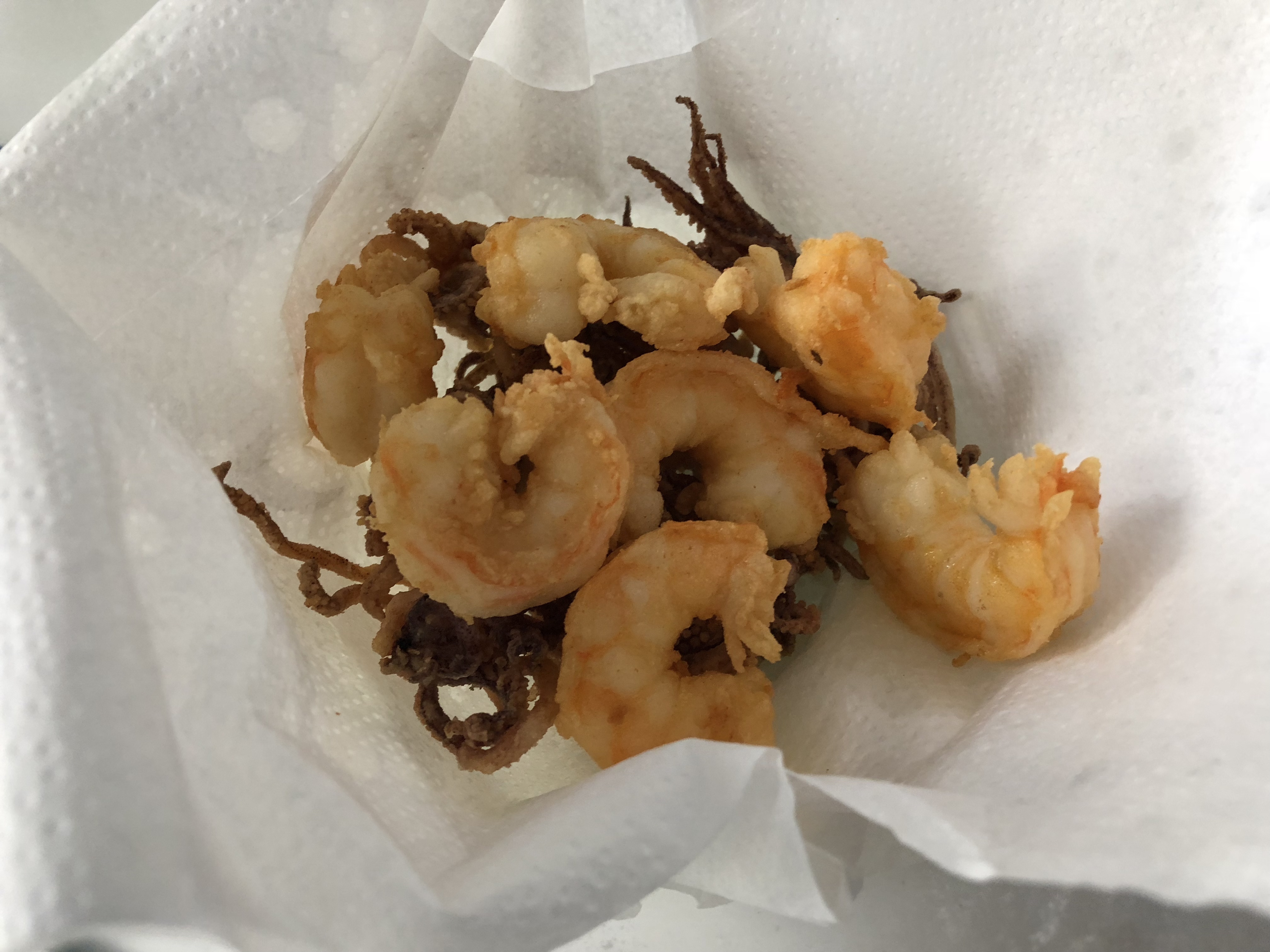 Finalmente, sacamos las patitas y los cuerpos de los langostinos, los enharinamos y eliminamos bien el resto de harina porque no es un rebozado, los echaos en una sartén con aceite muy caliente, prácticamente entrar y salir, los ponemos sobre un papel de cocina para que escurran y les echamos una pizca de sal.