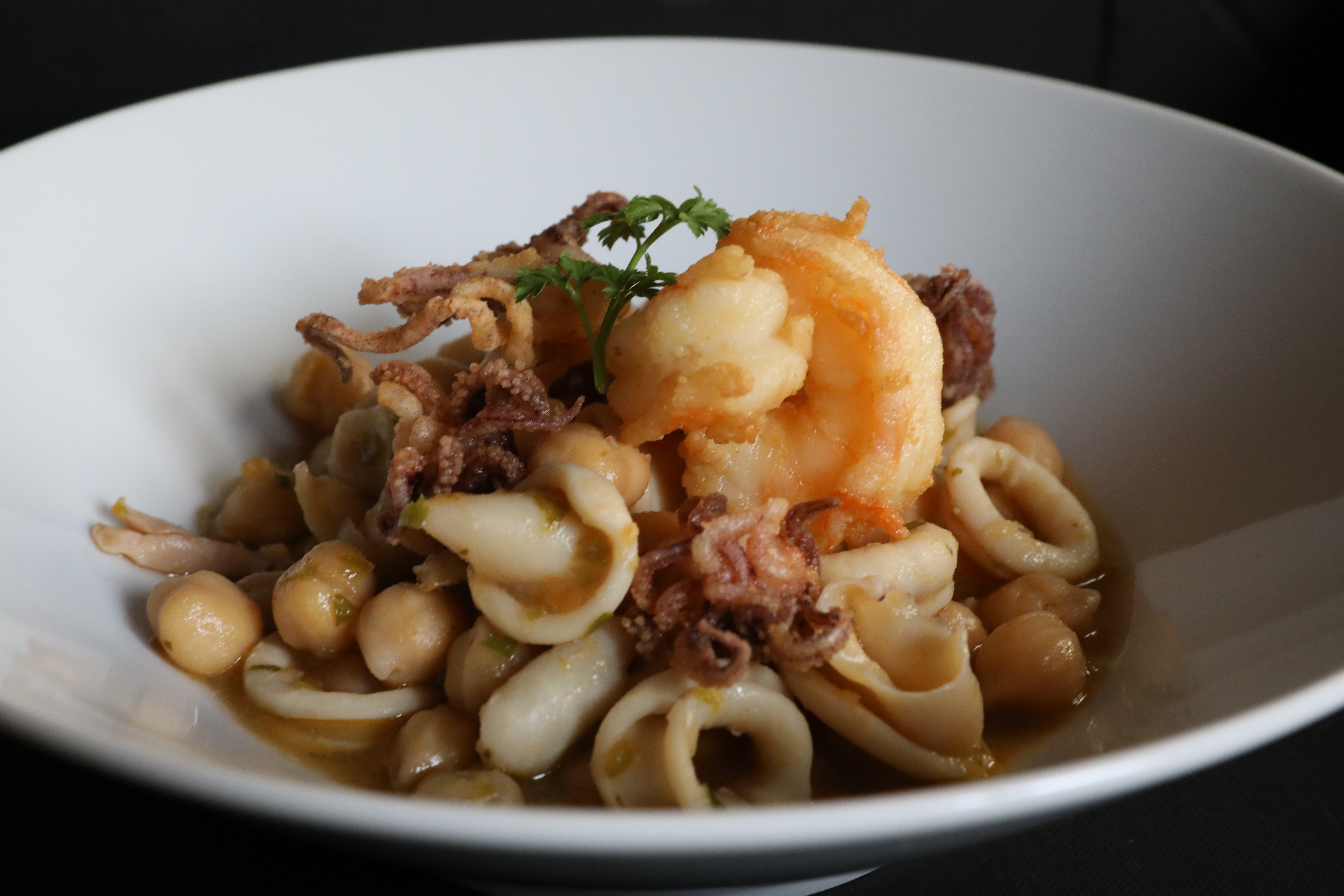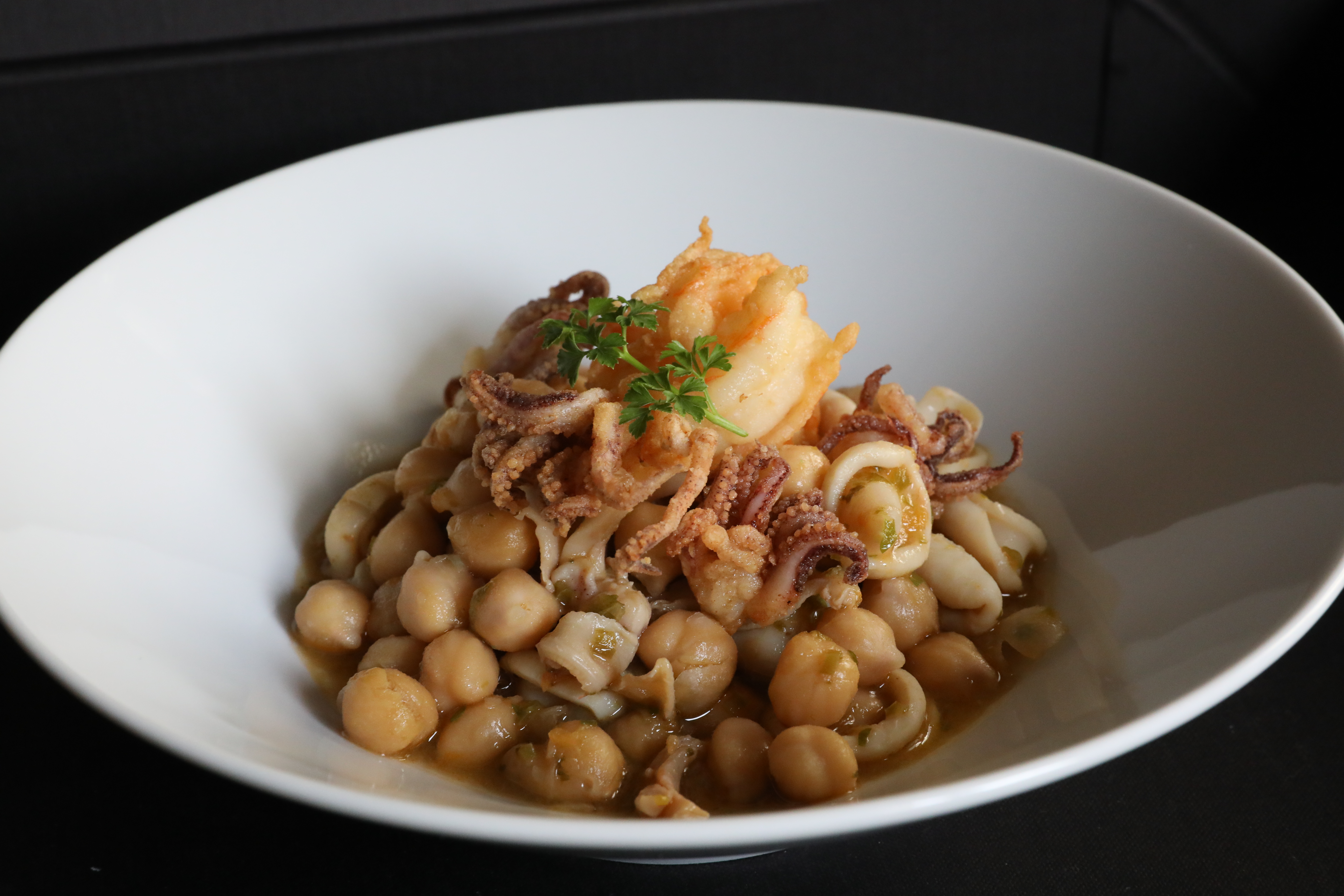 Incorporamos el resto de los chipirones cortados en anillas, le damos un par de vueltas y los echamos en los garbanzos, le añadimos el perejil picado, lo dejamos cociendo a fuego lento durante diez minutos, no más, para que no nos queden duros los chipirones y rectificamos de sal y pimienta.