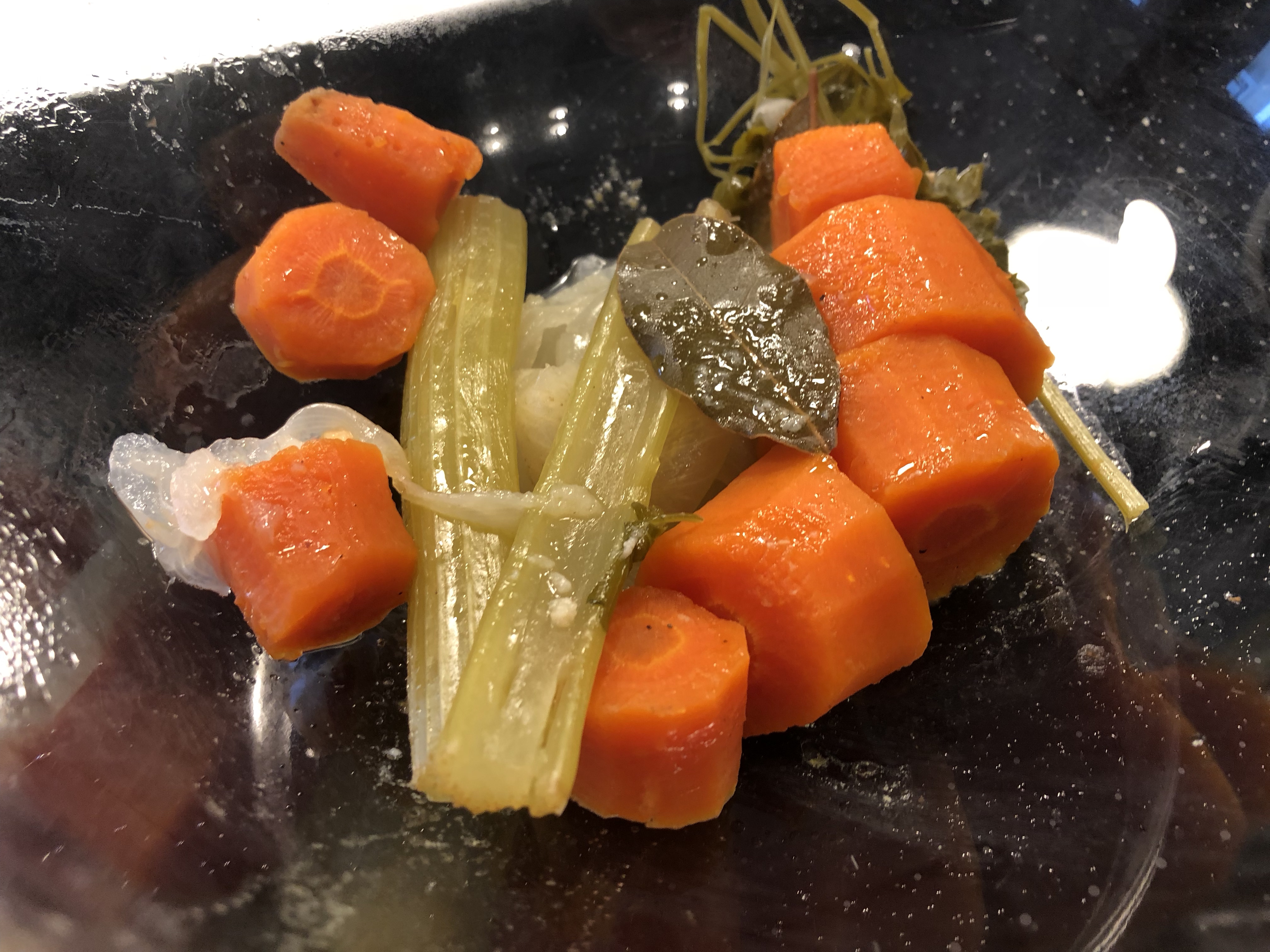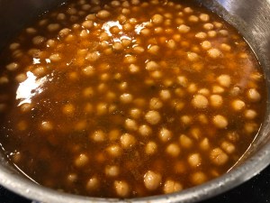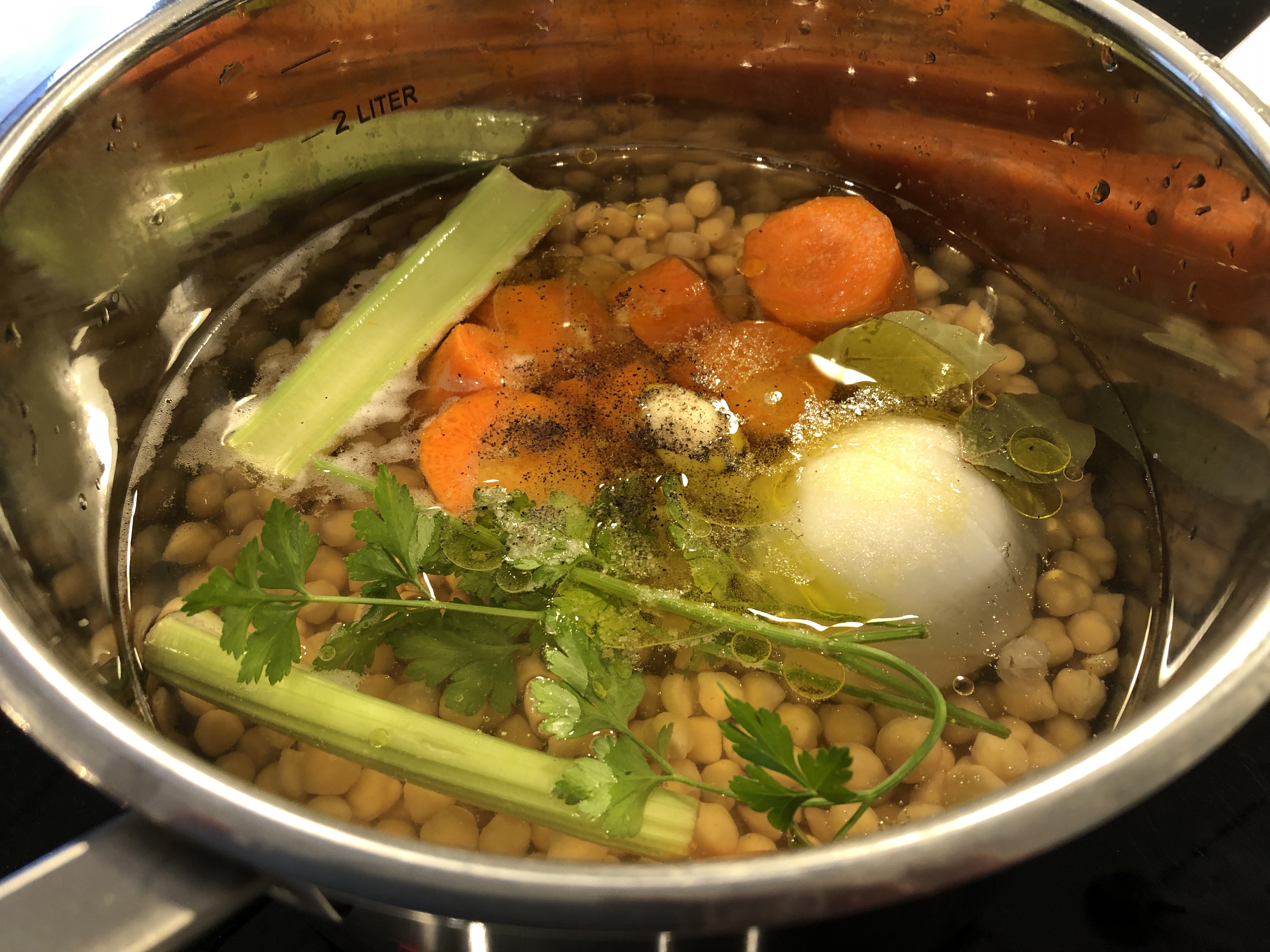 Los garbanzos si no los hemos comprado cocidos, los tenemos en agua desde la noche anterior, mínimo 8 horas, y los ponemos a cocer con media cebolla, una zanahoria, dos tallos de apio, una hoja de laurel, sal y pimienta, dependiendo del garbanzo, lo haremos con poca agua, sólo cubrirlos y les retiraremos las verduras, una vez cocidos, reservándolos en su líquido. Podemos triturar parte de esas verduras en el líquido de cocción para darle más cuerpo y sabor.
