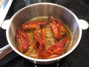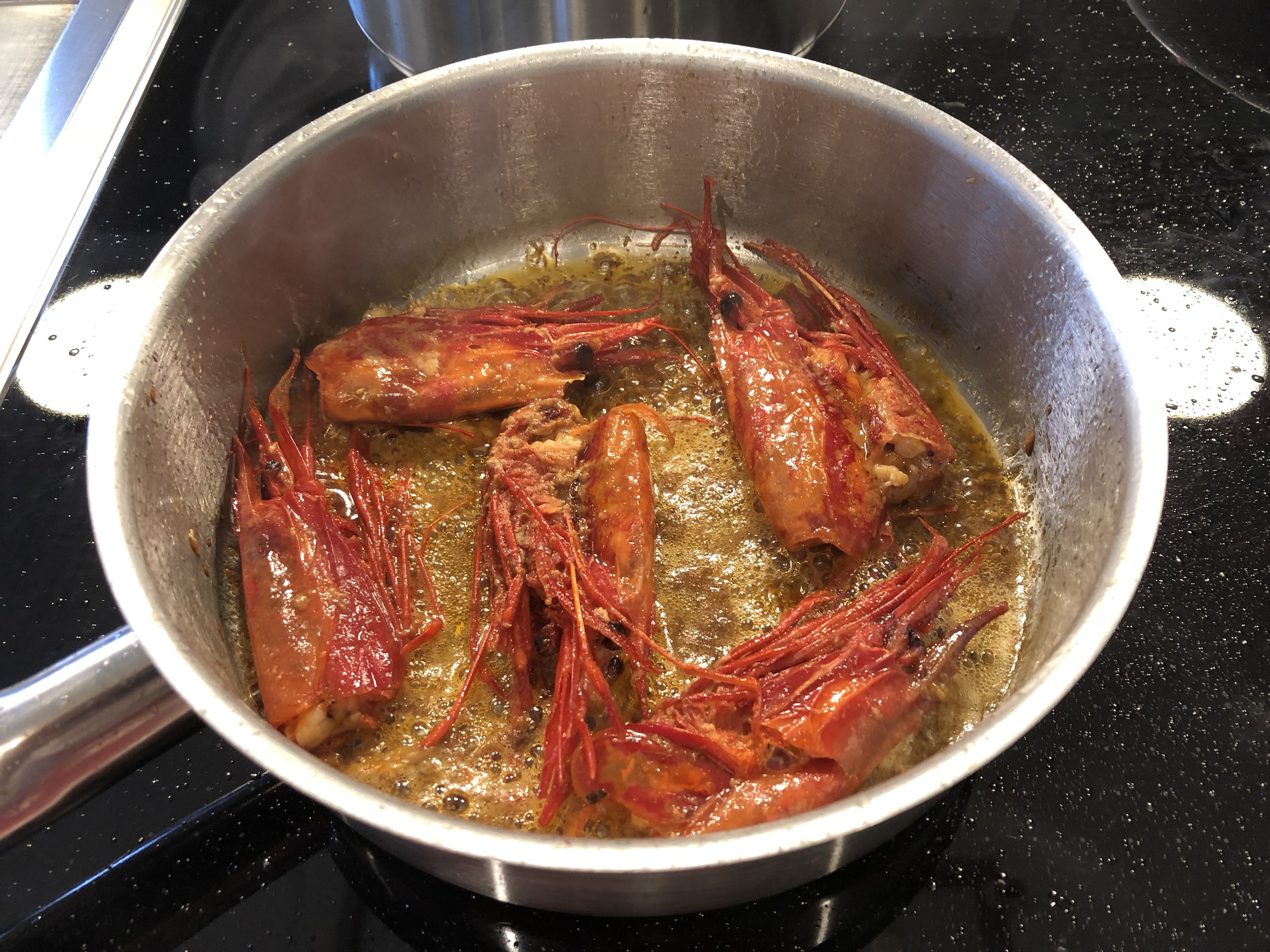 Mientras tanto, con unas gotas de aceite de oliva y cuando vayamos ya a servir para que esten calientes y recien hechos , salteamos los cuerpos de los carabineros.