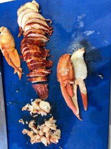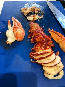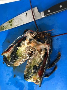 Empezaremos por el bogavante, éste es azul y de algo más de 1 kg, pero podemos ponerlos más pequeños y canadienses, hay algo de matiz en el sabor, pero esta ensalada tiene una base muy potente y seguramente no diferenciamos tanto entre ambos. Los tiempos de cocción variarán en función del tamaño, ya sabéis que 12 minutos por kg es lo aconsejable, aunque yo lo dejo un poquito menos.