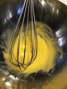 En un bol ponemos la yema de huevo, un poco de aceite, unas gotas de vinagre y el concentrado de la cocción de las cabezas, hacemos una especie de mahonesa para poner encima del bogavante y la probamos de sal, aunque el concentrado ya le da bastante sabor.