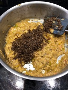 Por su parte, la carne de las patas la troceamos y ponemos parte en la cebolleta y otra con la lechuga.