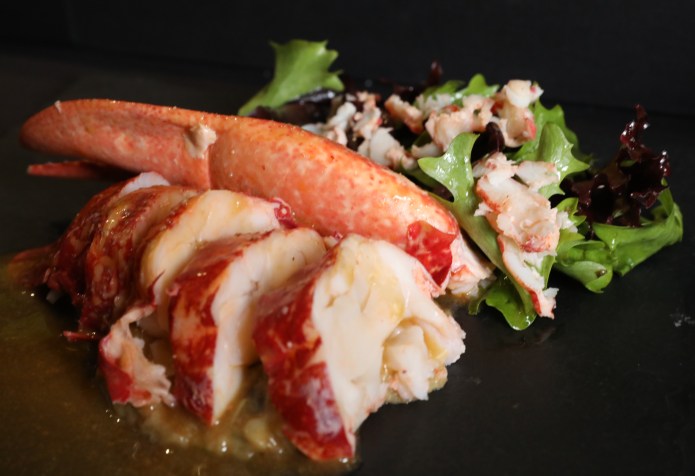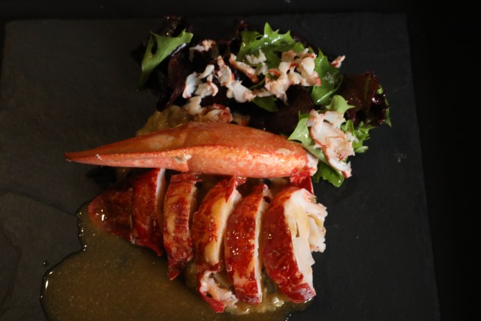 Como ya lo tenemos todo, emplatamos y ponemos la base de la cebolleta, encima de ésta el bogavante cortado, con un bogavante como éste hay cantidad suficiente para cuatro personas, por lo que partimos las pinzas en dos por su mitad y ponemos media en cada plato, añadimos un poco de ensalada y por encima o a un lado, la salsa.