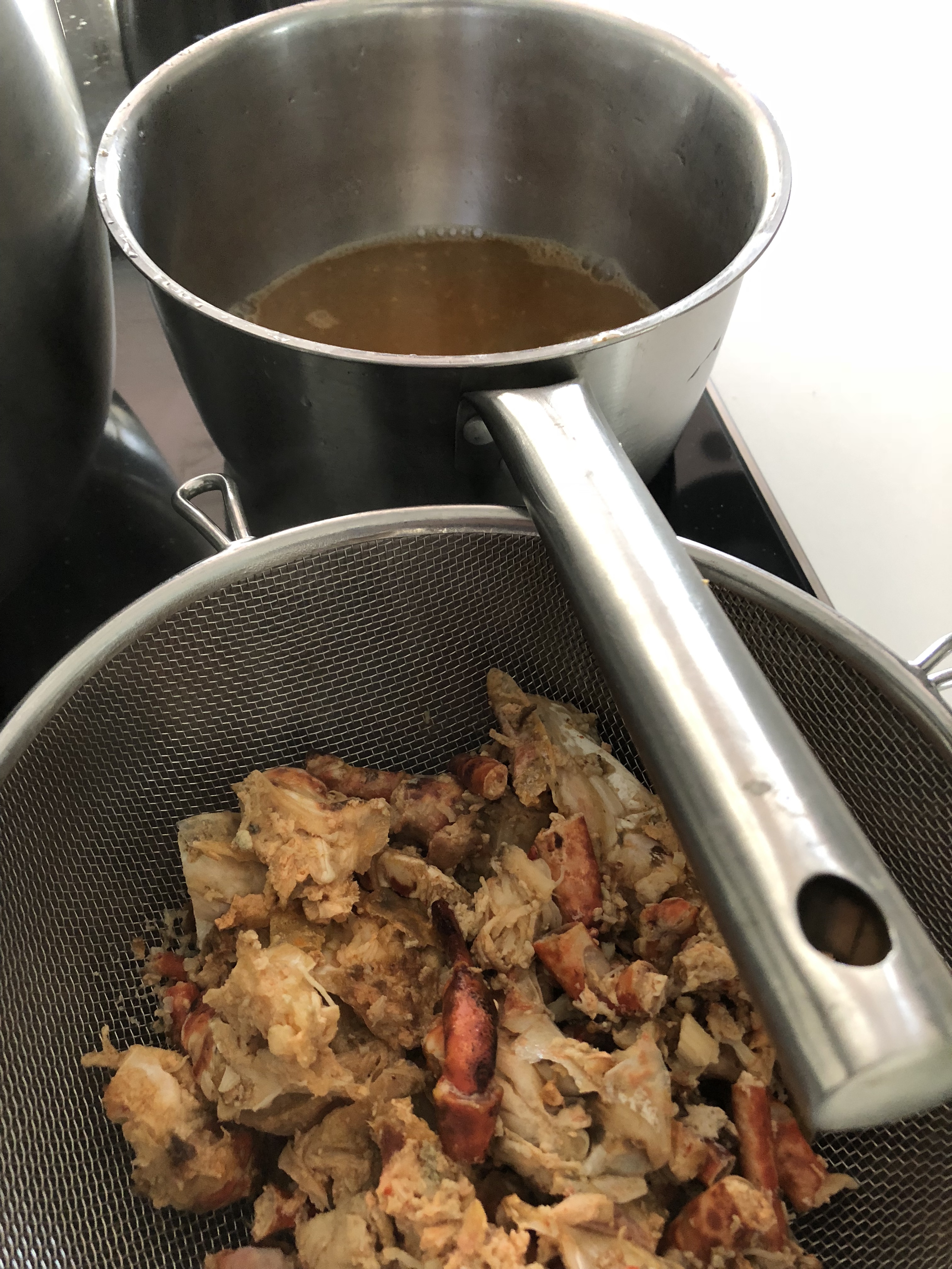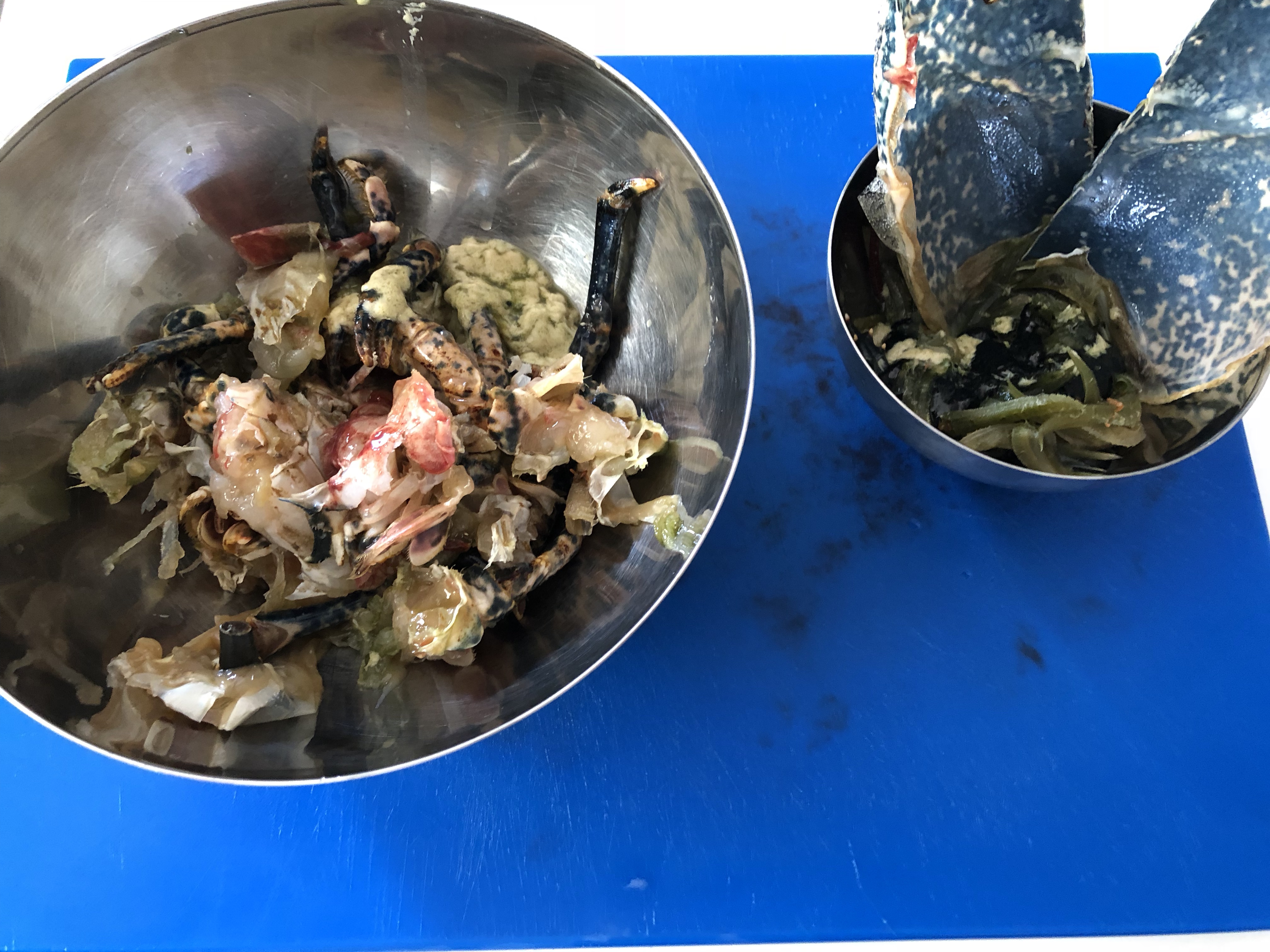 A continuación, ponemos abundante agua con sal, ojalá tuviésemos agua de mar, con un par de hojas de laurel a hervir y, cuando esté hirviendo, introducimos las pinzas y un minuto después las colas. Pasados diez minutos, las sacamos y las metemos en agua con hielo y sal para cortarles la cocción. Una vez frías, sacamos la carne de la cola, las pinzas y las patas, les ponemos un chorro de aceite de oliva y las filmamos o envasamos al vacío reservando todo.