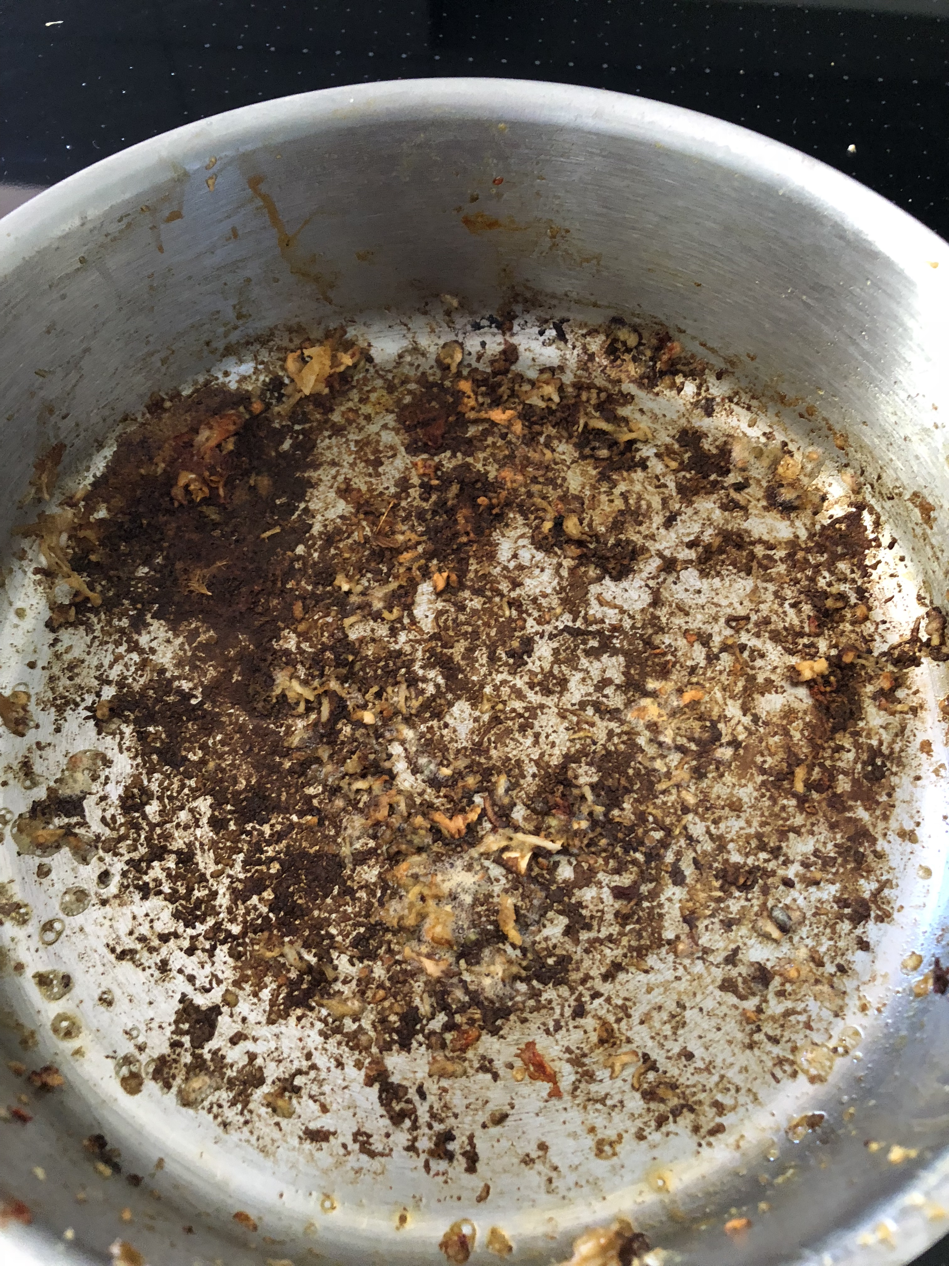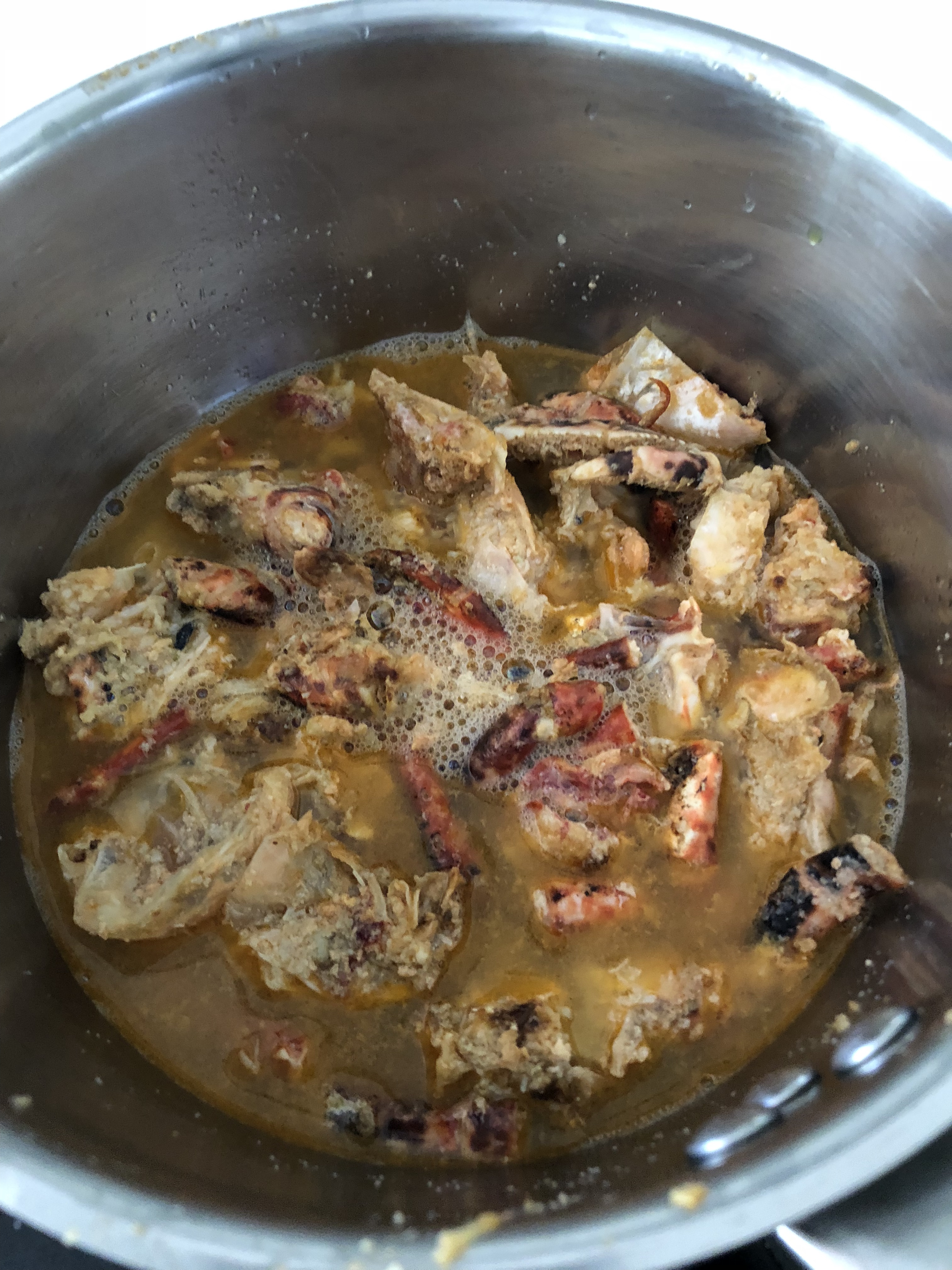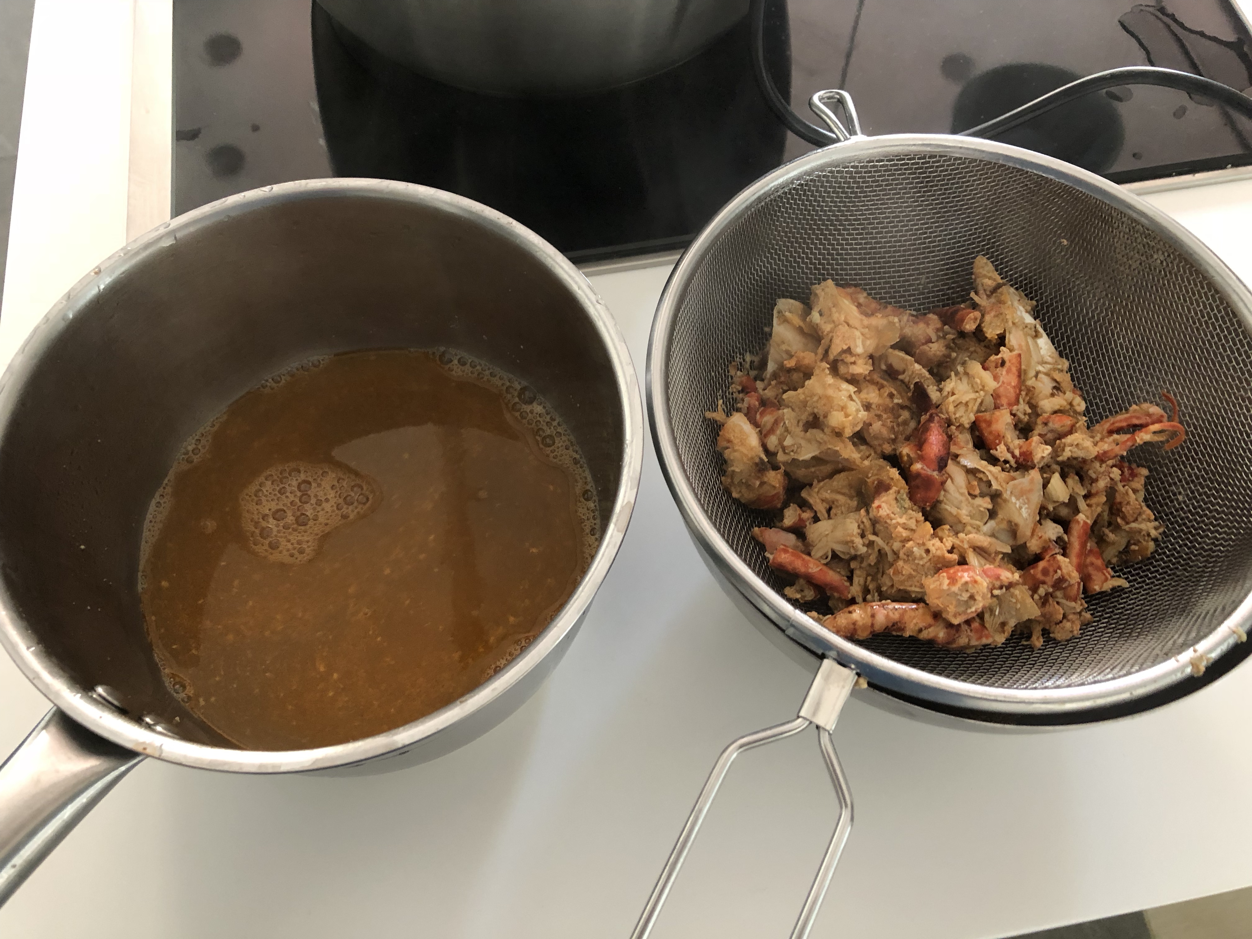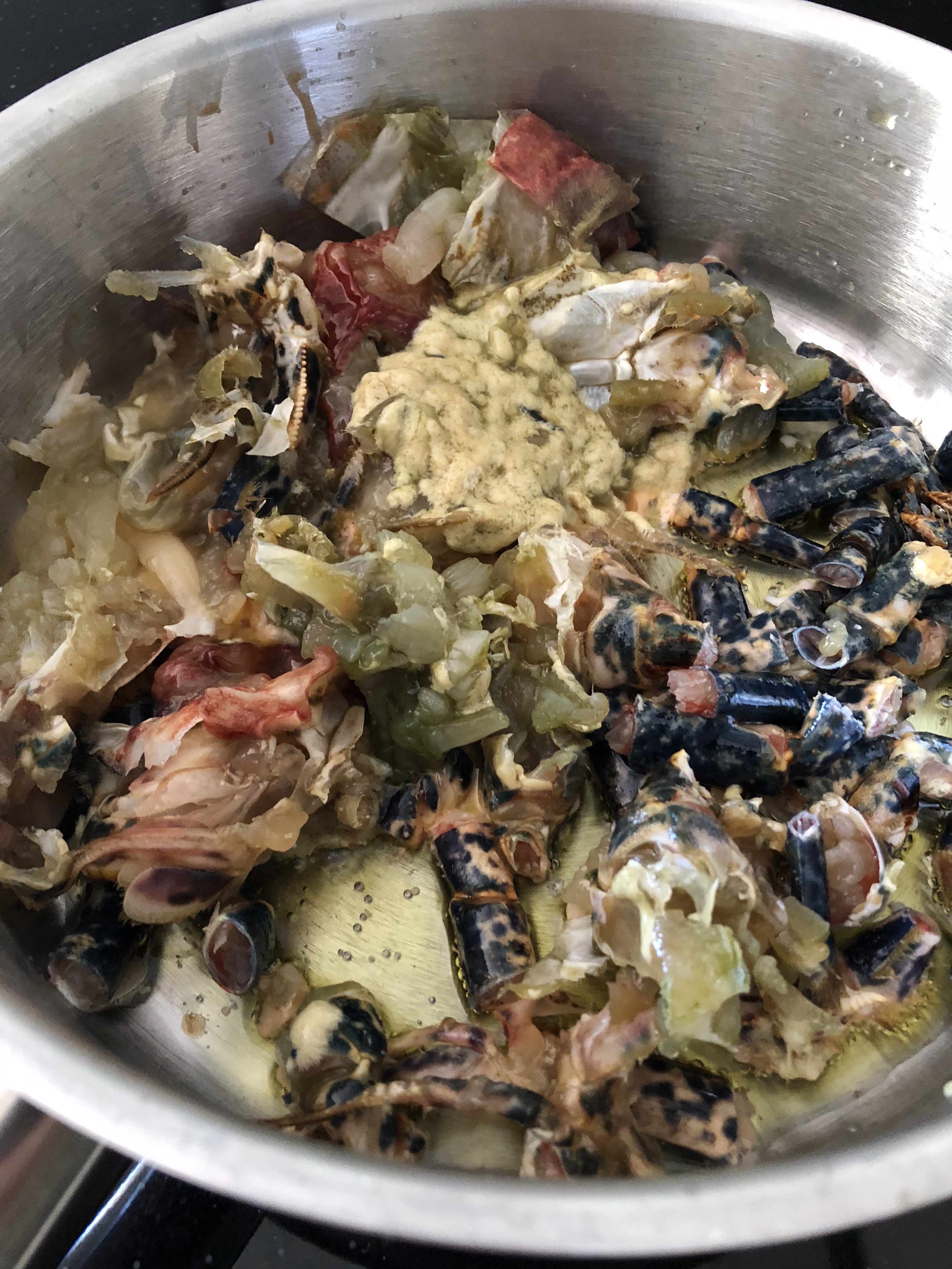 Seguidamente, abrimos la cabeza y la vaciamos, eliminamos las branquias y troceamos las patitas y todo su interior, ponemos aceite en una sartén que no sea antiadherente, ya que queremos que nos queden sucs, y salteamos todo. Después lo retiramos a un cazo, donde ponemos todos los trozos y el fumet de pescado, y lo dejamos cociendo de 20 a 30 minutos a fuego muy bajo tapado sobre los sucs que nos ha dejado la cabeza.