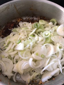 Por su parte, la carne de las patas la troceamos y ponemos parte en la cebolleta y otra con la lechuga.