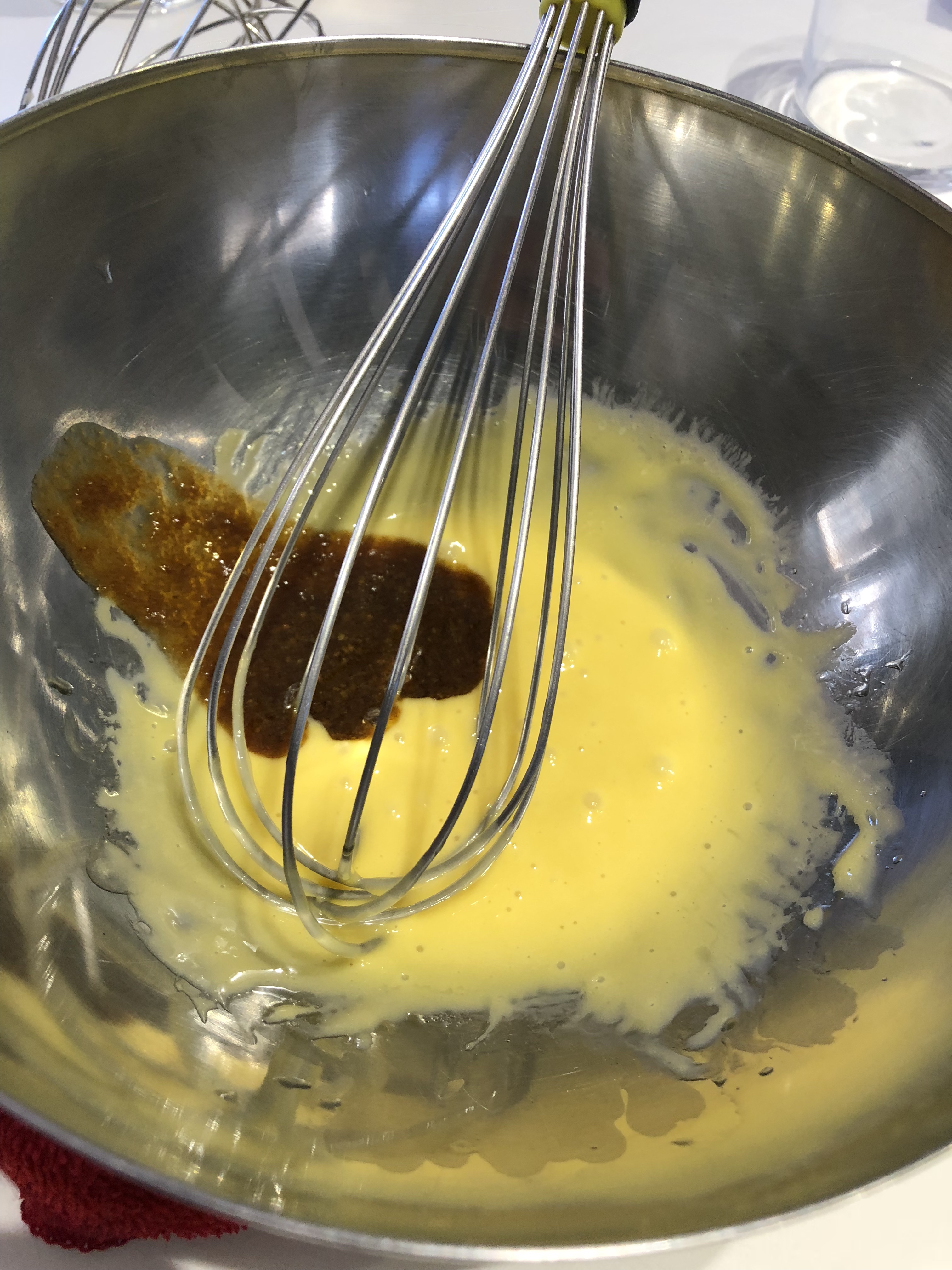 En un bol ponemos la yema de huevo, un poco de aceite, unas gotas de vinagre y el concentrado de la cocción de las cabezas, hacemos una especie de mahonesa para poner encima del bogavante y la probamos de sal, aunque el concentrado ya le da bastante sabor.