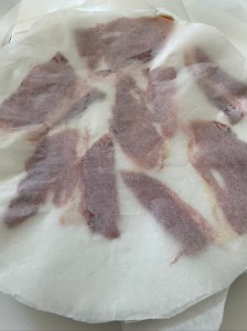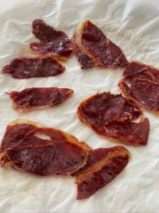 También ponemos jamón entre dos papeles de horno y dos platos en el microondas a máxima potencia durante minuto y medio y lo picamos.