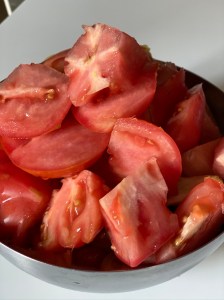 Empecemos por el principio que son los tomates. Hay mil variedades y mil precios, según el tomate que elijas necesitarás mayor o menor aderezo con el fin de darle sabor. Si os fijáis en la foto yo tengo ahí, pera, ensalada, Raf , rama y rosa, os preguntareis por qué tantas variedades, es porque al final los tomates que pongo son los que tengo en la nevera y, si no tengo suficientes de una variedad, cojo de las otras hasta completar.