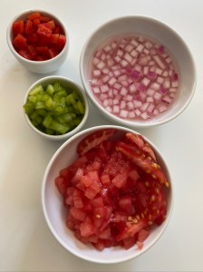 A continuación, preparamos el acompañamiento que servirá ademas de adorno. Es importante que realicemos todos los cortes del mismo tamaño y en ellos incluimos el tomate sin semillas, pimiento rojo y verde y cebolla morada. Esta última podemos ponerla en un poco de agua para que pierda un poco de fuerza, escurriéndola en el momento de emplatar.